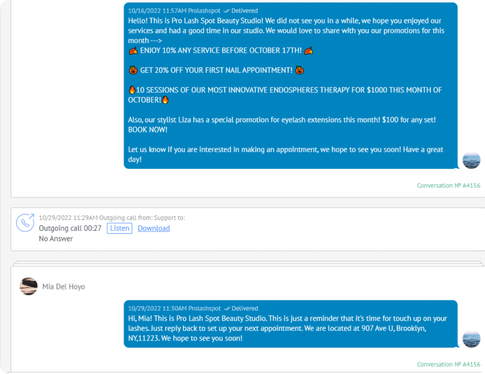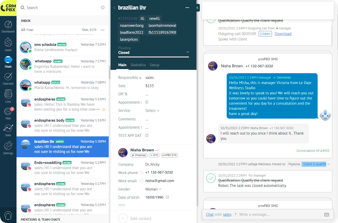 Todas as mensagens enviadas de ambas as partes são automaticamente enviadas para o seu sistema CRM. Pode iniciar uma conversa por SMS sem sair da plataforma. Também temos um bot de vendas que automaticamente se integra com o Kommo CRM.