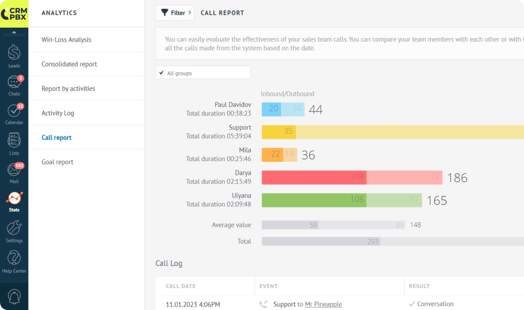 A análise de chamadas mostra toda a informação sobre as chamadas feitas para todos os números da sua empresa. Todos os contactos estão associados à chamada, simplificando a tarefa de encontrar clientes e contactos.