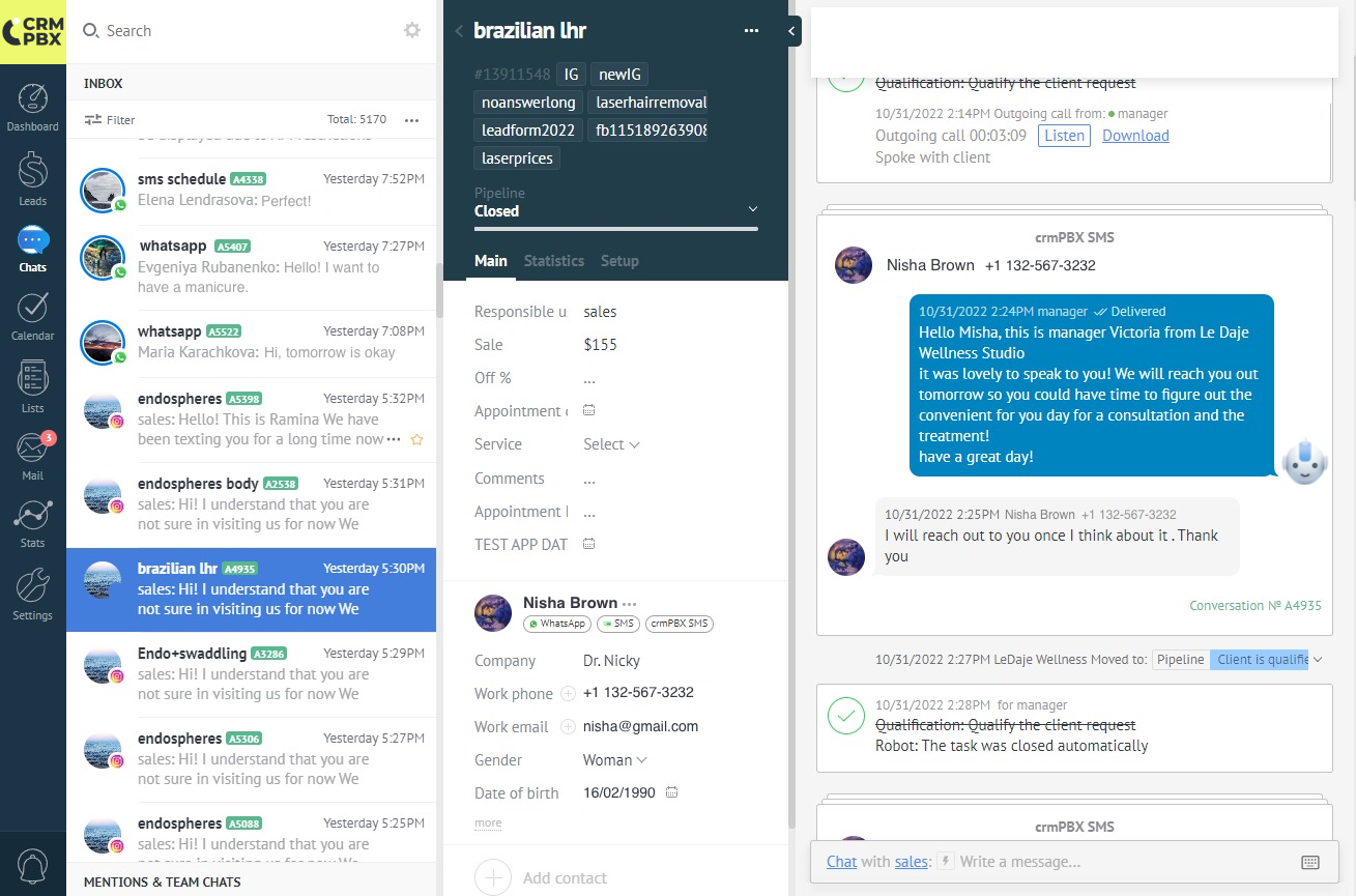 Все сообщения интегрированы в CRM-систему. Вы можете отправить из CRM. Более того, существует Sales Bot, который интегрируется с нашей телефонией.